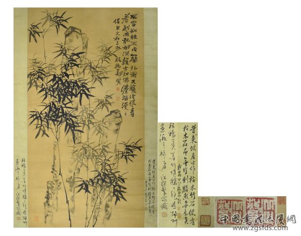 此图由简劲的笔锋,勾勒出坚硬的岩石,悬崖陡壁,气势雄伟,好似深山危崖之一角,又一种天然自成之趣。在整个坚硬瘦石折裥处略施以小斧劈皱,崚嶒之态顿出。少有皴擦,亦不点苔。石前新篁修竹数枝,瘦劲挺拔,竹枝不高,竹干极细,但不脆弱,极其傲然。笔致灵动疏爽,竹浓石淡,浓淡辉映,妙趣横生。两竿老竹顶天立地,叶少而肥。简洁清秀,高低错落,竹有虚实,墨有浓淡,充分体现了郑燮画竹的简瘦美感。郑板桥尤擅画竹,他一生专注于画竹,格调超人,从而奠定了他在画竹史上别人无法企及的位置。