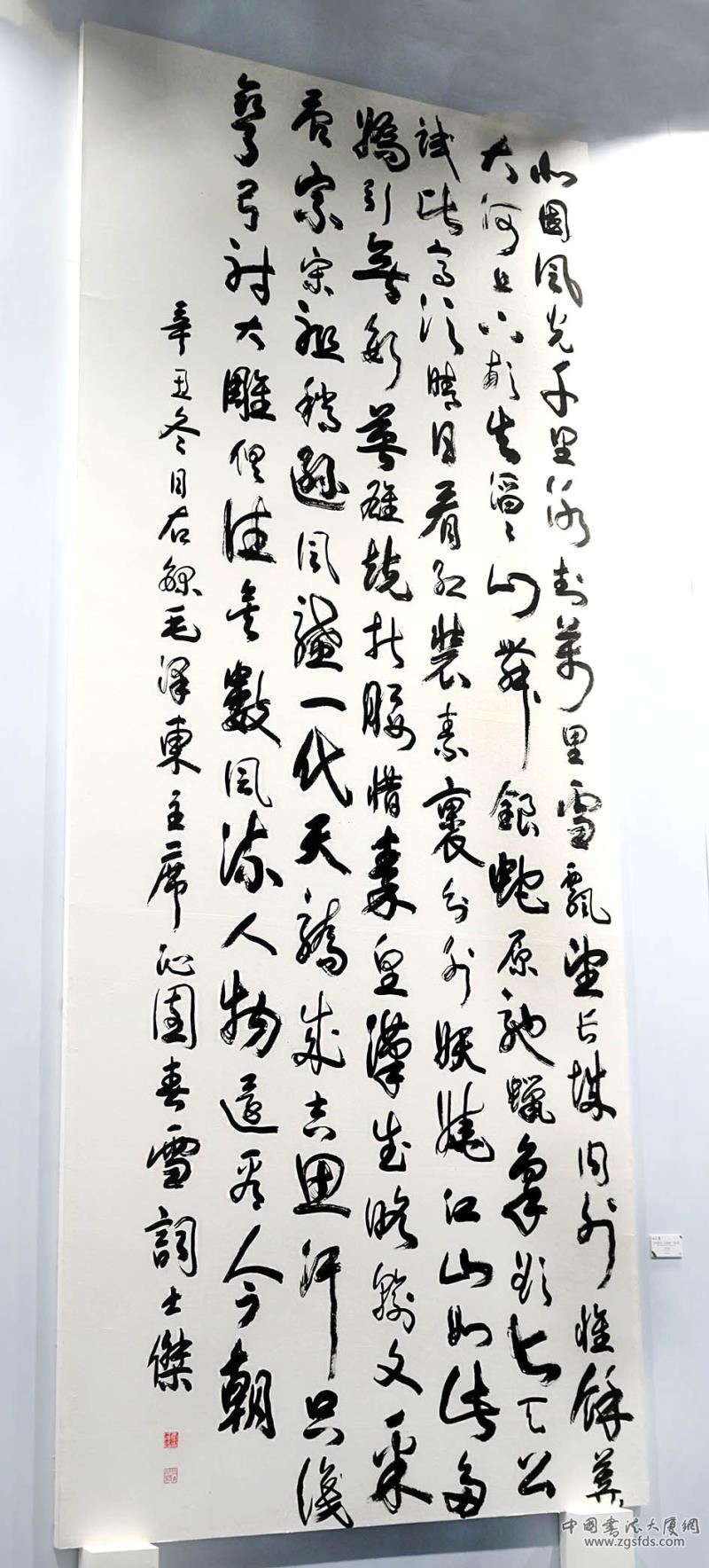 左侧便是李士杰先生创作的书法巨幅作品《自作冬奥诗》和《毛泽东—沁园春·雪》词,两幅作品均高6米,宽3米。整幅作品笔墨厚重,拙朴雄浑,从心所书,浑然天成。另有四幅不同创意书法作品也彰显鲜明艺术特色。