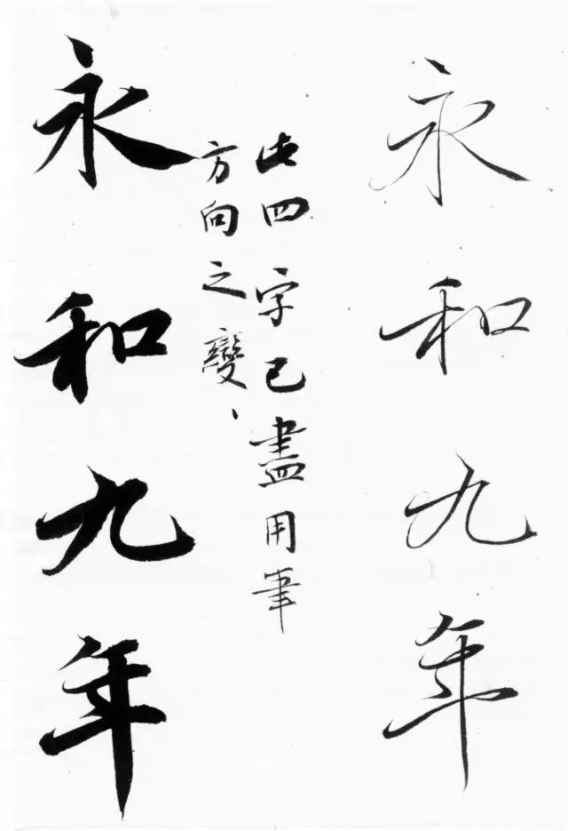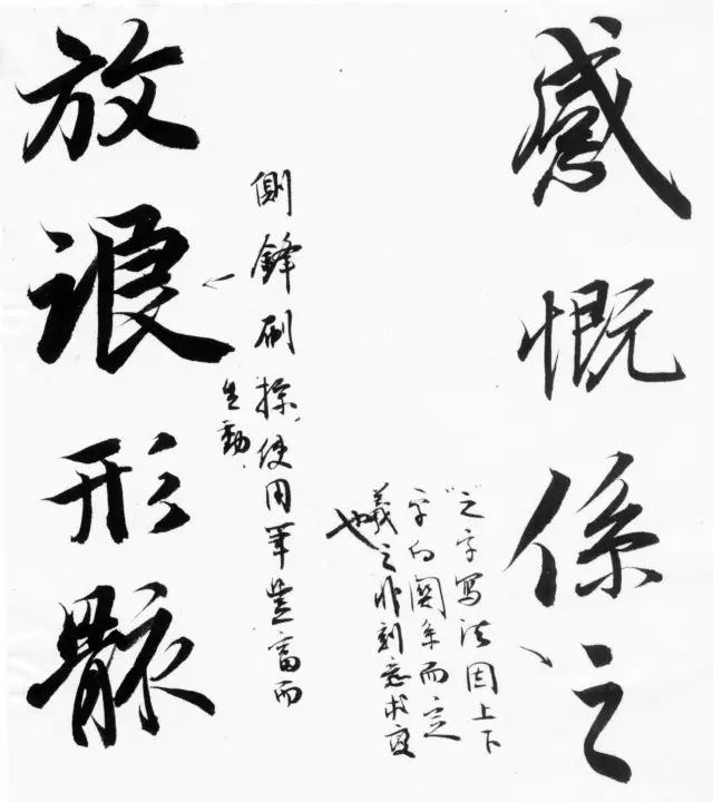 用笔的藏露,古人很早就注意到了,比如东汉蔡邕《九势》云:“藏锋,点画出入之迹,欲左先右,至回左亦尔。”其实,用笔的藏露是相互转换,相辅相成的,这是一个笔锋调整的过程,也是一个节奏转换的过程。露锋取势,点画多生动而见性;藏锋蓄势,点画多含蓄而生情。用锋的藏露转换在《兰亭》中得到了充分运用,羲之自己也说:“用尖笔须落锋混成,无使毫露浮怯,举新笔爽爽若神,即不求于点画瑕玷也。”(《书论》)尖笔落锋混成需要极强的笔力与自信,这也是晋唐行草笔法的精髓。