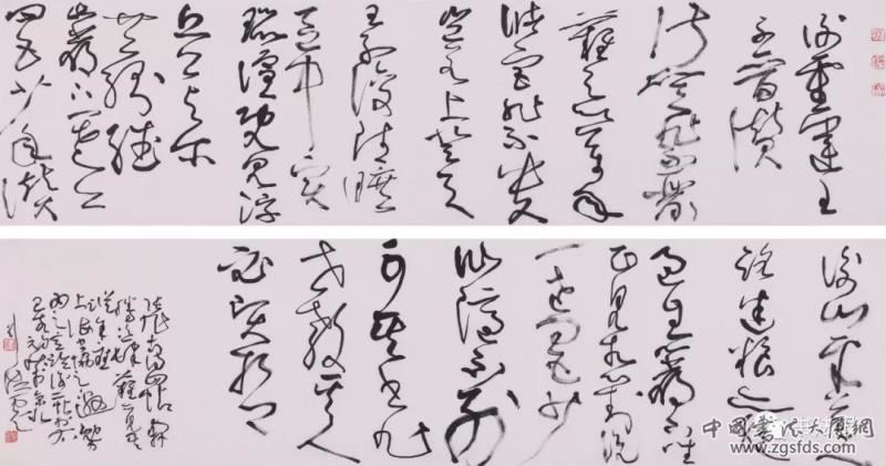 5.巨幅作品尤其是草书巨幅,“排兵布阵”至关重要,所谓“致广大”。既要从容不迫,又要率性洒脱,让字里行间充满大小粗细、快慢疾徐、干湿浓淡、长短正斜、疏密虚实、曲直方圆等对立统一关系;