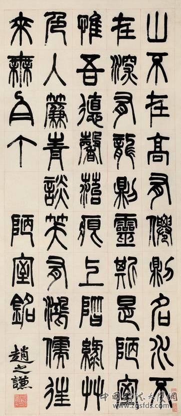 泰不华篆书作品欣赏《陋室铭》卷,纸本,纵36.9cm,横113.5cm。1346年43岁时作,书法兼善篆、隶、楷。篆法师宋徐铉,下笔多用方折,行笔圆活遒劲,结构疏朗工稳,末笔多作尖锋,即“悬针”笔法。此为迄今所见泰不华唯一的篆书真迹。作为一个少数民族文人,能写如此齐整秀逸的汉字古体实属难能可贵。