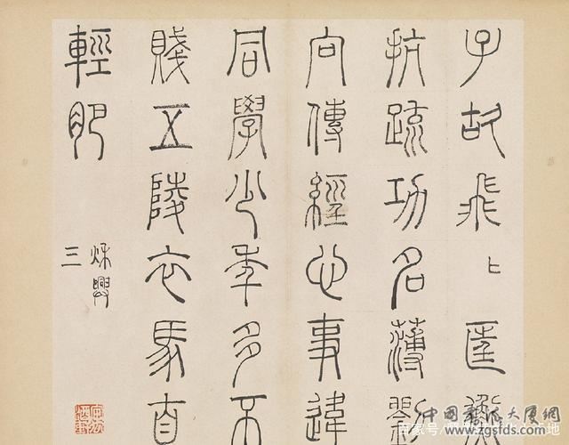 回到前面,也应证了沈鹏所说的古人讲究章法与传统笔墨的这一点上,看似乎是通篇的小篆书法作品,其实这一个作品之中还混合了楷书的用笔,二者合一,非常漂亮。