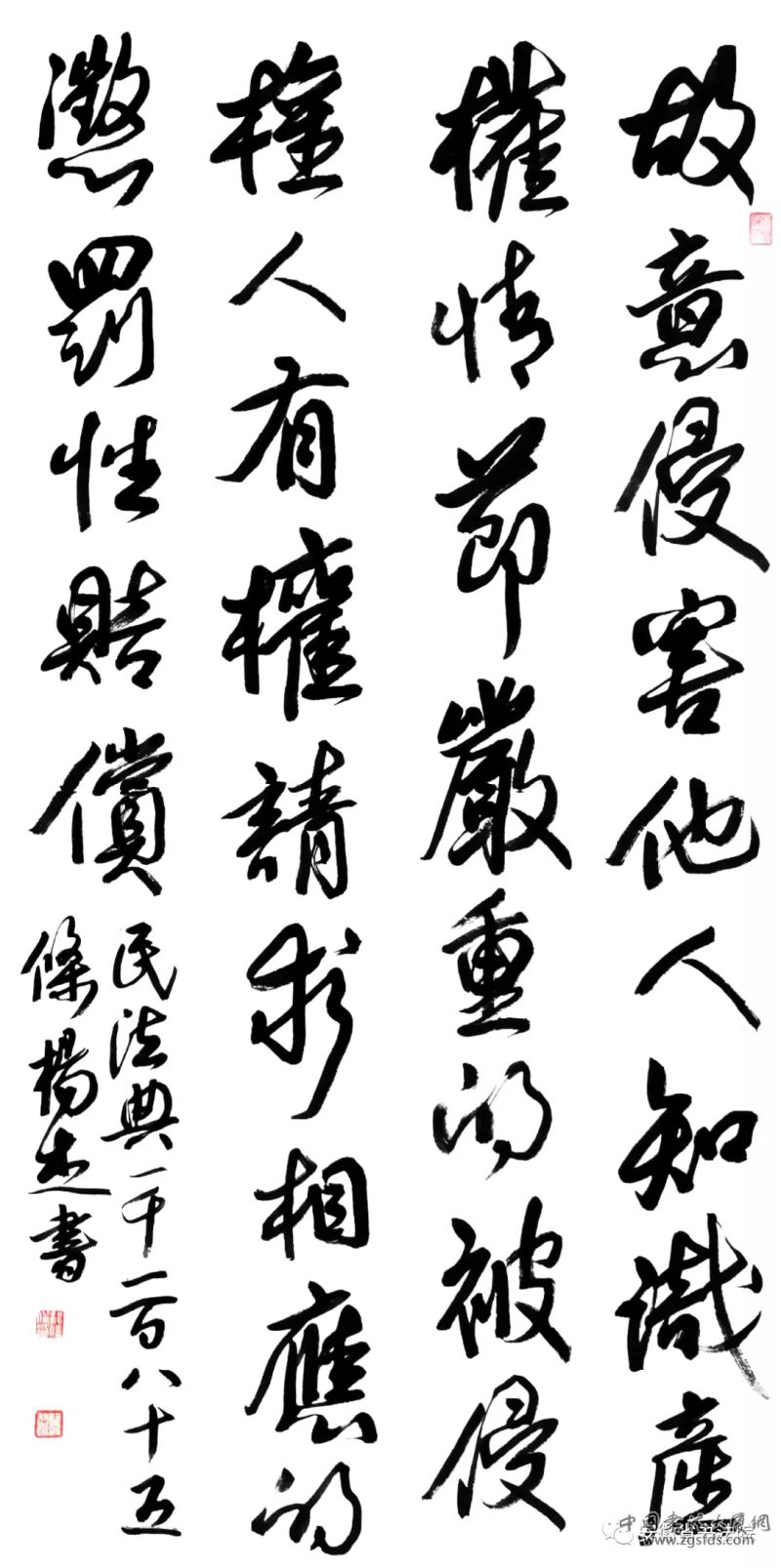 江苏省书协副主席、徐州书协主席马亚在致辞时表示,民法典以书法艺术形式呈现,使大家在欣赏书法艺术的同时了解了民法典内容;书写民法典体现出了书法工作者胸怀大义、心系人民、肩负责任的时代担当。将书法展示与普法宣传完美结合,通过法治文化与传统文化融合互动,创新了法治宣传教育形式,充分发挥了书法艺术的引领和熏陶作用,增强了法治宣传教育的趣味性和实效性,有利于推动书法家成为弘扬法治文化、传播法治文明的支持者和参与者。