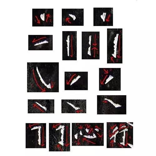 《点》刀向左上斜,以右下角切入石中即呈。如刀向左下斜,以右上刀角切入石中,即呈夕。只要稍变方向,就可以刻成许多形状的点。