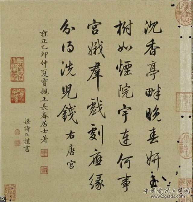 吴宫 白苧轻盈响屧廊,青龙舟里换晨粧。 夜游朝宴千年乐,那信人间有越王。 楚宫 渚宫春暖翠华遥,帘幙风轻裊细腰。 不道君王深注意,行云行雨隔迢迢。 秦宫 春锁阿房静管弦,尘生舞袖為谁妍? 从来不识君王面,忽过人间卅六年。 汉宫 水晶盘净玉腰酥,爱舞因怜可用扶? 底事天家万乘富,等闲难获画明珠。 魏宫 平生戎马乐何曾,铜雀虽成几度登? 不為夜臺听不见,悲歌一曲向西陵。 晋宫 灭蜀平吴处上游,大开武库兵甲收。 而今四海浑无事,只驾羊车日夜游。 隋宫 海错山珍杂綺罗,鑾舆空待未曾过。 夜深欲识君游处,但看飞萤点点多。 唐宮 沉香亭畔晚春妍,玉樹如煙院宇連。 何事宮娥群戲劇,應緣分得洗兒錢。 齐宫 步步莲华步步春,香凝罗袜不生尘。 何须洛浦遥相见,已是人间有洛神。 陈宫 结绮临春户对开,后庭花发引金杯。 景阳钟晓方酣宴,不信横江木梯来。 书法神品《十宫帖》出自清朝乾隆时期的太子太傅梁诗正之手,是为当时宝亲王(乾隆)的七绝诗所书。堪称千古书法的上乘之作,现藏于故宫博物院,是国宝级文物。 梁诗正(1697—1763)清朝大臣,钱塘(今浙江杭州)人。雍正八年探花,官至东阁大学士。梁诗正工书法,初学柳公权,继参赵孟頫、文征明,晚年师颜真卿、李邕,编历代名家书法真迹《三希堂法帖》。又受命撰《唐宋诗醇》、《西清古鉴》。 本网编辑:陈甜甜