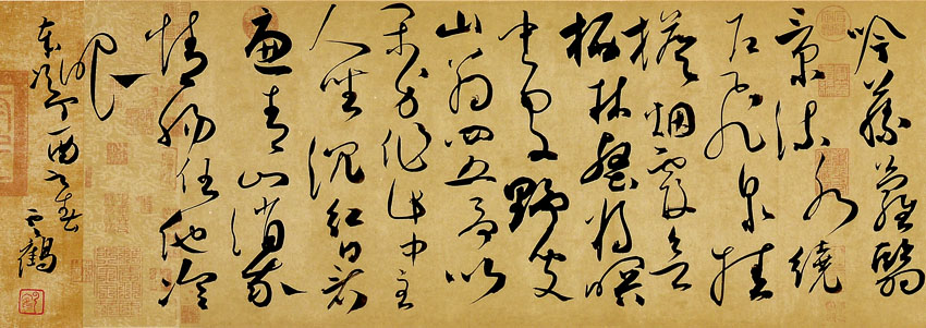 “你写的草书我虽然看不懂,也不认识,但看上去很美。”一次笔会上,一位先生挺兴奋地对我如是说。作为普通读者和观众,又有多少人能读懂和认知草书呢?但“看上去很美”,起码是作品传递了艺术的基本功能,因为艺术的基本功能就是审美。再好的艺术如果不能审美,不能向欣赏者传递美感,那都是白搭,所谓艺术品就是创造美和审美,至于其他倒不是很在乎,我们最关注的是这件艺术品美与不美,所以当我们在面对某件草书作品时,第一关注度不是该件作品的内容如何释读,而是该件作品的审美指数和美誉度。这种情形在我们遇到的经典名作如《怀素自叙》、《张旭古诗四首》以及黄庭坚的《诸上座》、《李白忆旧游》等,都可以随时感受到,如果没有机会亲临接触真迹,去翻看出版的这类精印的字帖,你同样会有这种感受的。我常想在当今这个社会,我们无法指望人人都能释读、欣赏草书,但只要欣赏者在面对草书艺术作品时,从中真正感受到它蕴含着美的情愫时,使其精神上充分得到愉悦,那就OK了。至于草书中的内容的美或不美,是草书创作者的文学修养问题。当然,欣赏者的个人修养也很重要,修养愈高,精神上的愉悦空间则更为广阔,满足度也更高,反之,则稍逊。诚然,最重要的还是作品本身美的能量勃发,这不是“情人眼里出西施”的一厢情愿就能获取的,因为艺术的审美虽与情感有关,但仅有情感还是远远不够的,它有潜在的审美标准和规律。