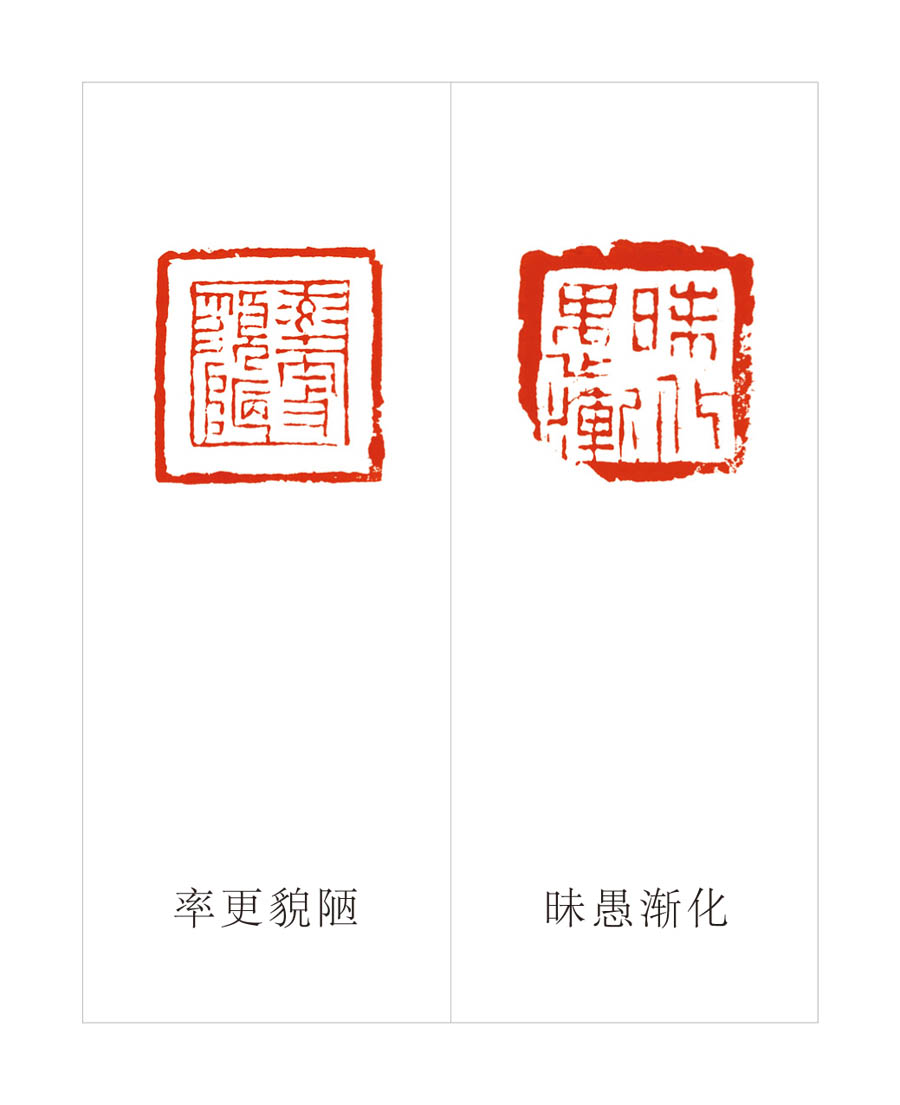 张继的篆刻以汉印为主,得益于错落生姿的汉将军印。他师法汉印有两点:一是汉印形式,是平直方正的摹印篆,这是其篆刻的基本定式;二是他又不完全就范于汉印的形式,多方取意,融会变通,匠心独运。不入汉印,就不懂汉印,就不懂篆刻;不解脱汉印模式,就不懂创作,其中微妙,张继知之。其《中国书画千字文》组印基本上以汉印形式为主调,以汉印精神为引领,来表达汉印的浑厚、平正、质朴乃至远隔时代的神秘感。他在师法汉人创造精神而不囿于汉印模式。