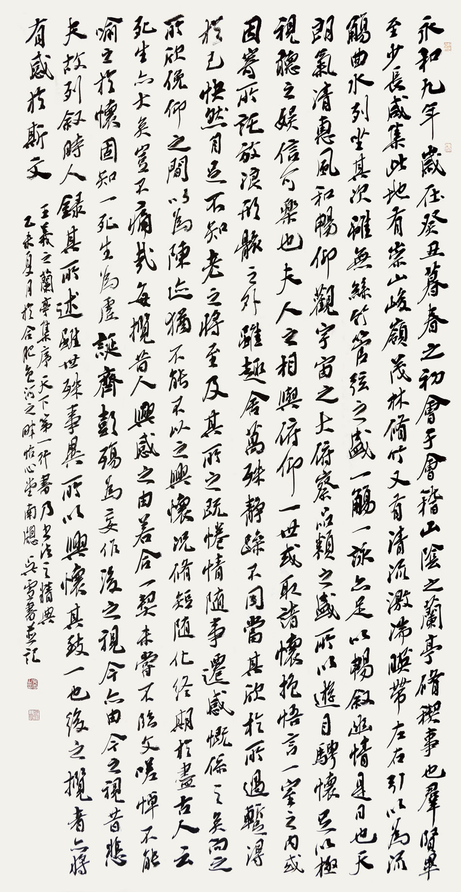 他是一位专业书家,具备坚实的书法功底和丰富的书法创作经验积累。其书以楷书、行书名世,精研晋唐楷法,深入“二王”行草并兼取米芾、王铎体势,功力甚深。近两年来又拓展书路,兼涉各体,于甲骨、金文、简帛、碑志等历代书迹广泛研习,功底因之更加深厚,风韵愈益潇洒出尘。其行书尤其巧中见拙,内涵篆隶笔意,逸兴遄飞,笔墨变化常显意外之趣。其书文人气甚浓,和气、天真、痛快,尤其是近期所书胆气壮,用笔爽,能够以气领势,以势生情,深入古法而新意迭出,步入一个更高的境界。