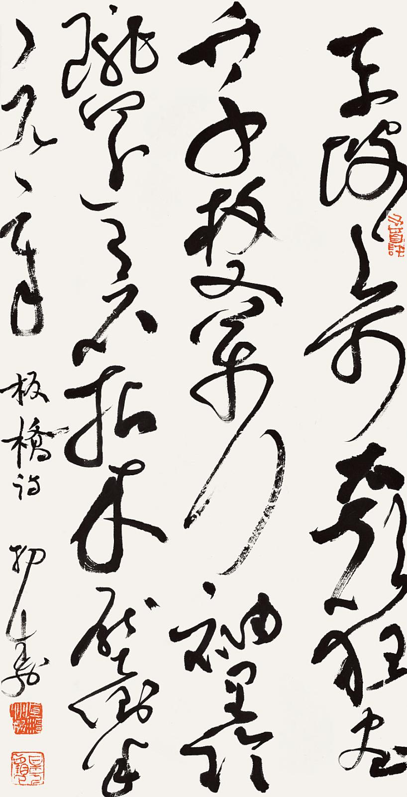 杨涛所说的“不管中锋侧锋,锤炼线条质量才是重中之重”,已深切地体会到线条是艺术生命魂灵的物质载体。因此他承继张旭“心藏风云”的大草精神,不效时流不落野俗,让翻飞的线条遒劲超迈,如海中神鳌、飞天游龙,以彰显大草书的深奥奇变。垂滕樛盘的缭绕线条最需要沉实而灵活,否则死蛇挂树毫无生气。苏东坡谓:“草书难于严重”,杨涛是通过涵泳篆籀古隶去增加线条的厚重宏肆。力求酣畅淋漓、沉实而空灵。去除沉滞重浊。时不时添入笃实的方笔以增加古拙的气韵。甚至别出心裁地将一组方厚长短不一的浓厚线条错落叠放在一起,成为整个作品章法旋律的视觉重心,与虚灵缥缈的用笔形成强烈对比,以造成奇拔豪达的气势。让线条有深奥奇变的另一功夫是墨法。他的乡前辈黄宾虹老人讲:“……老天爷本领大,在地间造出了黑色,又造出白色,还造出五颜六色。我们画画,有时免不了要借用点天公的妙造”。历史上深知绘画的书法大师董其昌、王铎、何绍荃都是善用墨法的妙手。当今书坛艺术家领其衣钵借用中国画墨法成为书法创作的一种时代表征。杨涛借用了乡前辈墨法深厚华滋的妙造,营造了黑墨团中的广阔天地。他并不是简单含燥润于一画。通过墨与水的交融,通过笔的偏正与笔根肚锋的提按深浅、磨擦顿挫、扭动绞转的综合应用,在有意操控与偶然天成中造就线条的丰浓枯毛、湿烂旁沁。墨法与笔法浑然一体去造就奇拔豪达的气势与酣畅淋漓的高韵深情。当情绪激荡之时,墨汁四溅满纸狼藉,天花乱坠夺人眼目。但决不是野马脱缰,他总能将放肆外扬的一面包裹于沉著屈郁的气氛之中,将铿锵置于典瞻的气氛之中,呈现虚灵自由、畅达相谐之内美。他遵从“变动不居,周流六虚,上下无常”的《易》之道。企求将笔墨的重点关照放在挖掘线条意境的妙造上。因而对线条的质量的锤鍊以成为对生命力的锤鍊,重中之重是对当下艺术语境中自我活脱的魂灵的锤鍊。